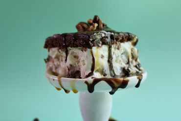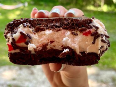 Fudge brownies hugging vanilla ice cream laced with fudge and chopped maraschino cherries. An upgrade to your average sundae - no spoon or bowl, just handheld happiness.